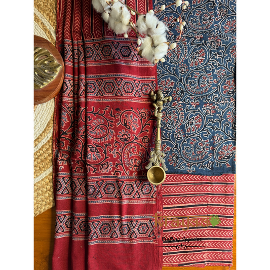 Red Natural Dyed Ajrakh Handblock Print - Unstitched Suit Set With Dupatta